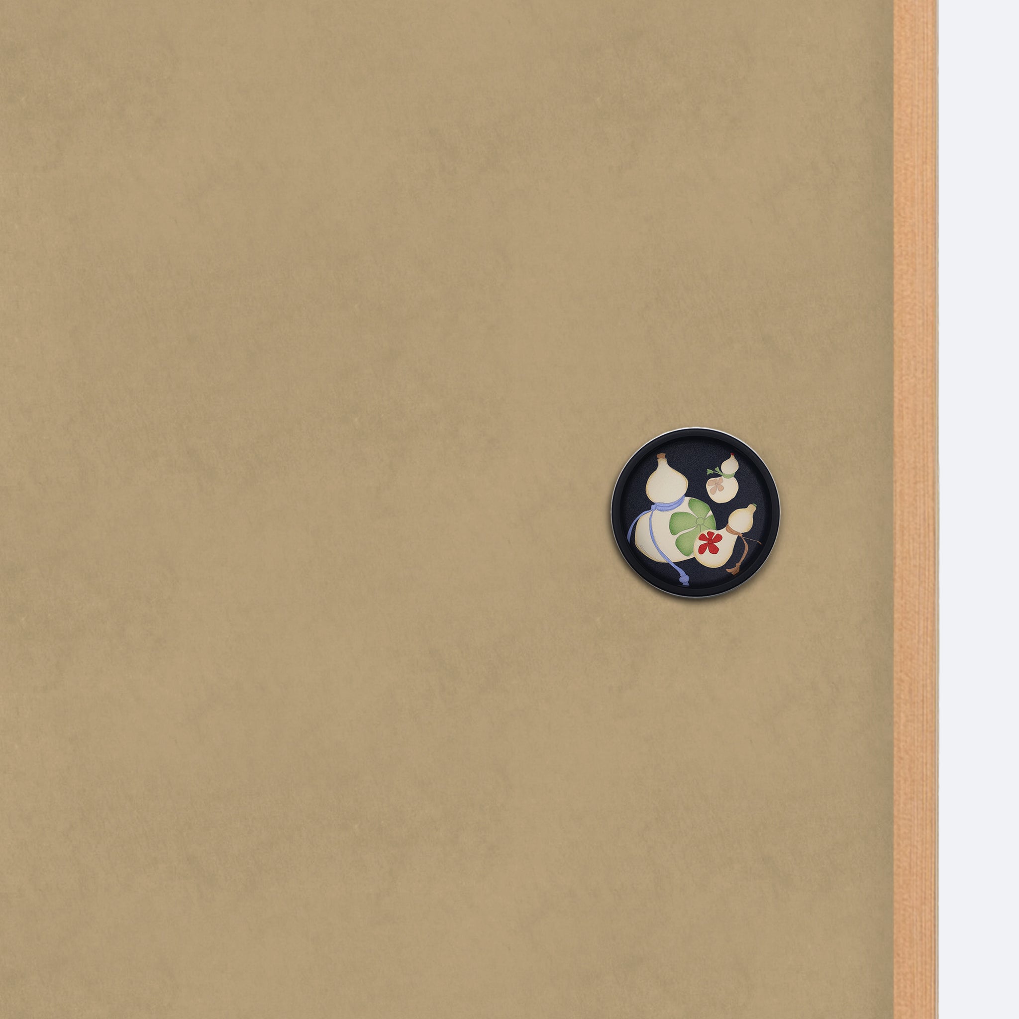 • 画像をギャラリービューアに読み込む, 多福の花柄の黒枠華引手を無地のふすまに取り付けた商品画像。引き手デザインのディテールが分かる写真。